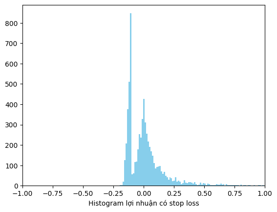 Trong đoạn code trên, biến stoploss được khởi tại là False mỗi khi vào lệnh khi giá giảm xuống dưới 10% thì cắt lỗ, biến stoploss sẽ được gán giá trị là mức lỗ khi cắt và được xác định là cắt lỗ rồi. Biến order_profit_with_stoploss là một dãy số định nghĩa mức lợi nhuận của từng lệnh trong trường hợp có cắt lỗ. Hình bên dưới là histogram của hai biến đó