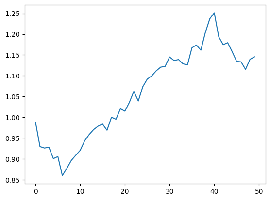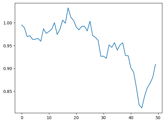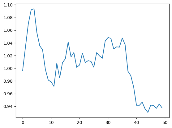 Chúng tôi sẽ giả sử biến động mỗi ngày của cổ phiếu trong một thị trường cân bằng là một dãy số ngẫu nhiên phân phối chuẩn có mean = 0 và std = 0.02. Khi đó giá cổ phiếu được biểu diễn bởi tích tích lũy của dãy số trên. Trong đoạn code dưới chúng tôi tạo ra 100000 dãy số như thế, mỗi dãy số bao gồm 50 số thể hiện biến động hàng ngày để máy tính có thể xấp xỉ các xác suất chúng tôi cần tính toán
